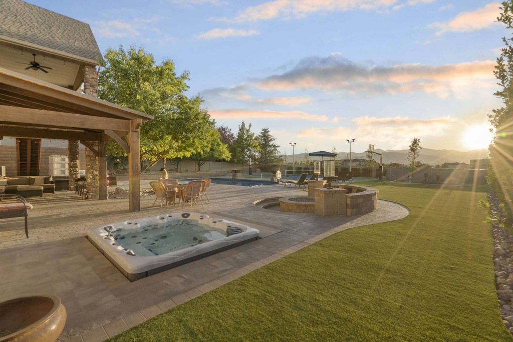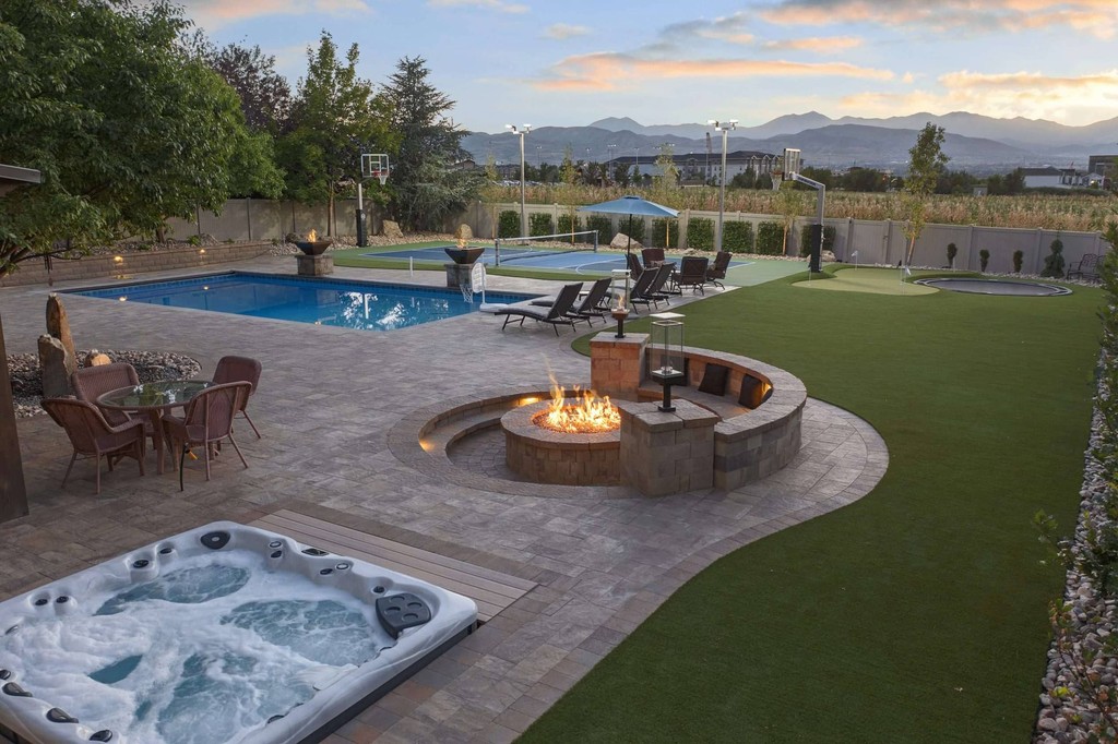Private Resort: The backyard now functions as a self-contained recreation destination — pool, sport court, putting green, fire pit, hot tub, and open turf — all in one property.