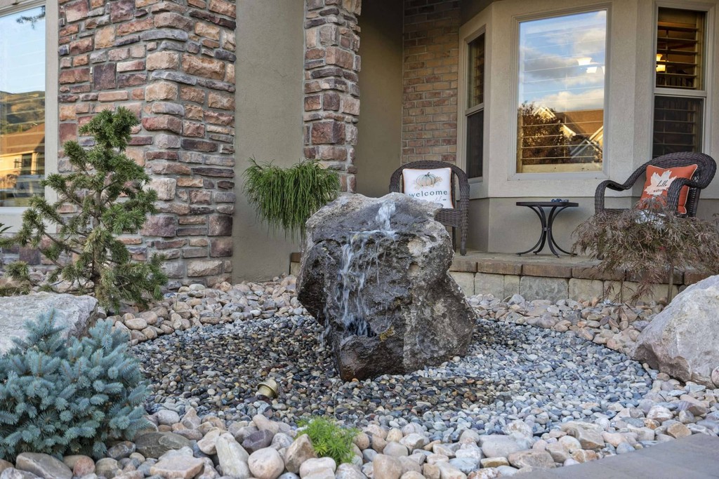 Installed a basalt column water feature as a front yard focal point and a natural boulder bubbler near the front porch entry.