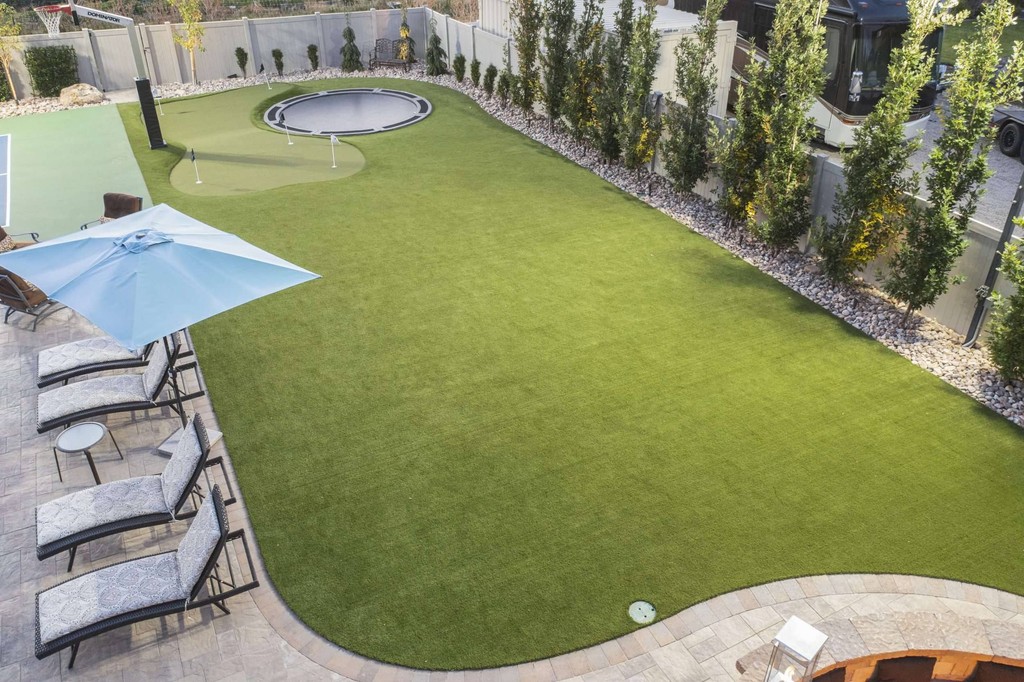 Created a custom putting green with multiple pin positions and contoured turf, integrated alongside an in-ground trampoline.