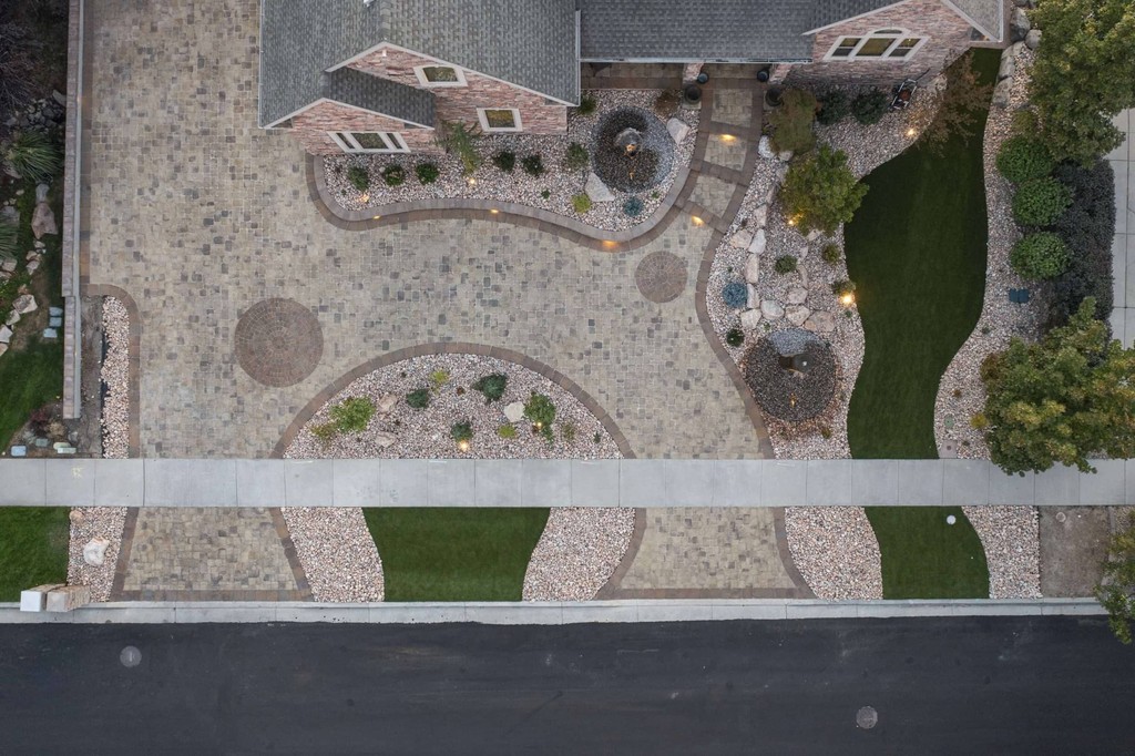 Designed sweeping curved paver walkways connecting the driveway, front entry, and park strip with contrasting border accents.