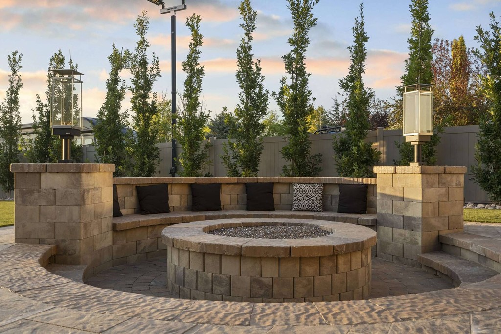 Constructed a circular gas fire pit with a curved block seating wall, built-in cushion storage niches, and stone pillar-mounted lanterns on each end.