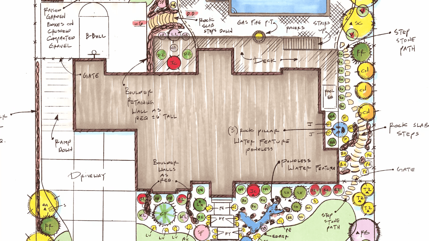 The hand-drawn landscape design plan showing the full property layout — pool placement, boulder walls, water features, planting zones, raised garden beds, and hardscape details.