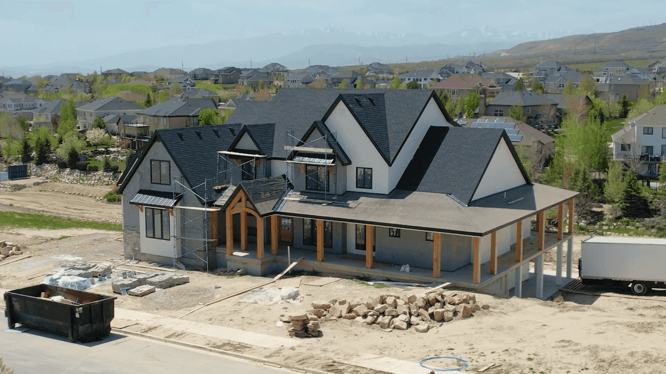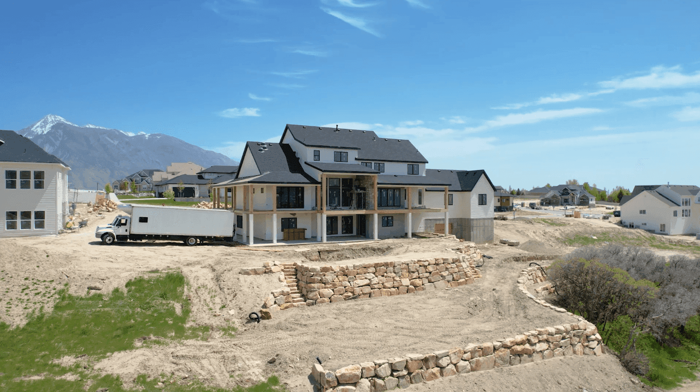 Before: the front of the home during construction — bare dirt, no landscaping, scaffolding still on the exterior.