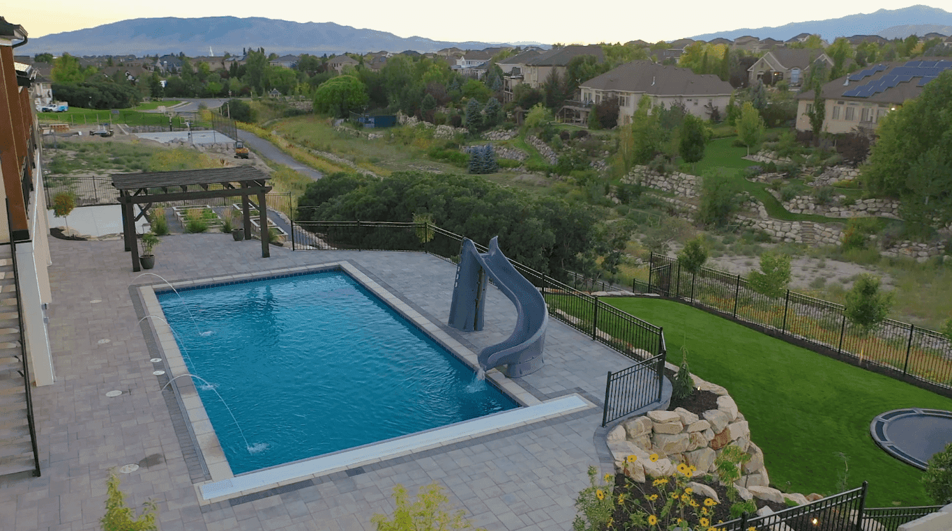 The pool terrace from above — paver deck, slide, pergola, iron fencing, and the multi-tier boulder retaining wall dropping to the lawn below.