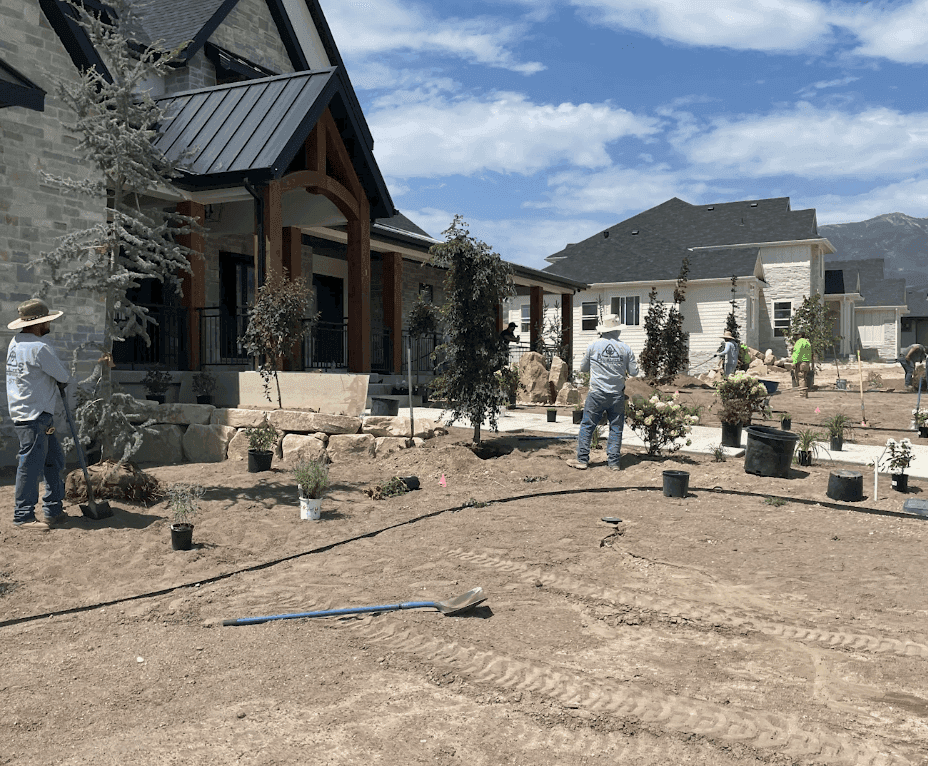 The All States crew on planting day — staging trees, shrubs, and perennials across the front yard before final placement.
