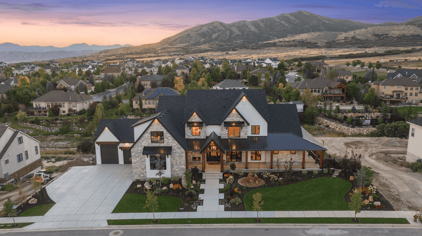 A ground-up landscape for a new-build modern farmhouse in Highland — featuring lush perennial gardens with bubbling rock water features, a multi-level backyard with boulder retaining walls, pool with slide, pergola, raised garden beds, and panoramic mountain views from every elevation.