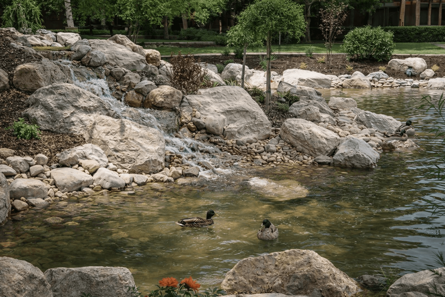 🍁 Stone & Finishing: Natural boulder and stone placement for a feature that looks like it emerged from the landscape.